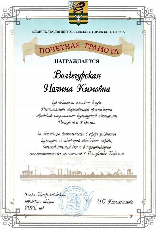 На очередной встрече Женского клуба еврейской общины Председатель Петрозаводского городского Совета Надежда Дрейзис от имени Главы Петрозаводского городского округа Инны Колыхматовой вручила Почетную грамоту руководителю клуба Полине Волчегурской «За активную деятельность в сфере культуры и традиции еврейского народа, большой личный вклад в гармонизацию межнациональных отношений в Республике Карелия». Благодарственными письмами также были награждены Елена Авишева и Нина Слободчикова – члены клуба. Приятно отметить, что деятельность Женского клуба замечена, и ее активисты удостоились этими скромными знаками внимания.